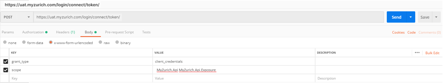 To get an access token, make a POST call to the authentication endpoint (https://uat.myzurich.com/login/connect/token) using the client id, client secret and either the primary or secondary subscription key obtained earlier. The scope should include MyZurich.Api as well as MyZurich.Api.Exposure.