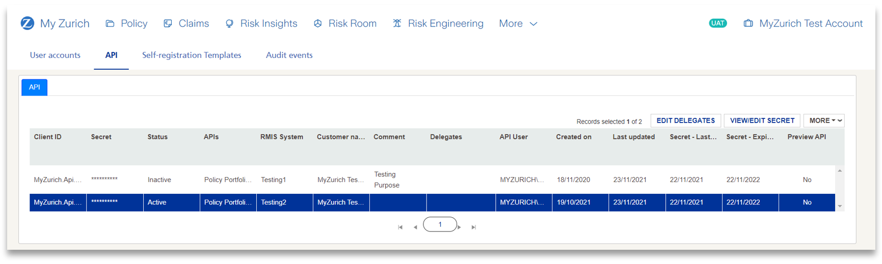 Viewing/ editing your API Credentials on the MyZurich platform: